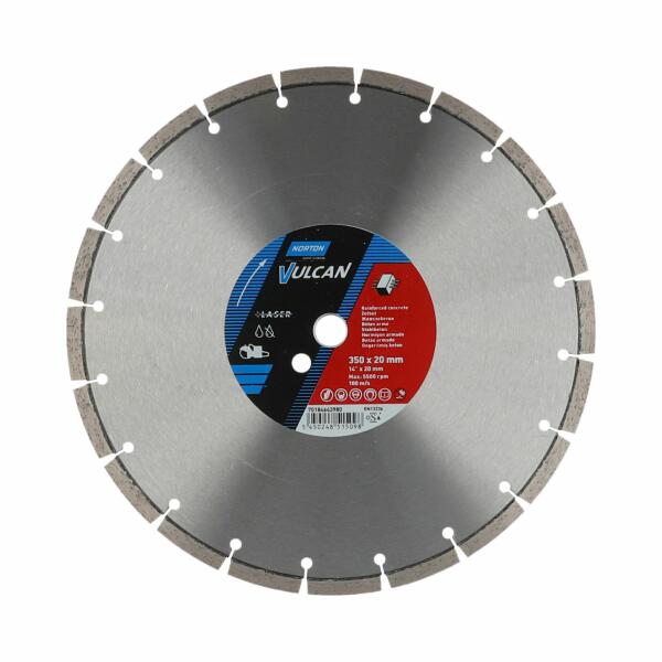 A Norton Vulcan Laser gyémánt vágókorong lézerrel hegesztett általános építőanyagok száraz és nedves vágásához. Felhasználás: építőelemek, öreg beton, vasbeton, kemény klinker, betonlapok, betonkéreg, mészkő, klinker útburkoló kövek és homlokzati téglák vágásához. MŰSZAKI ADATOK Gyártói cikkszám: 70184643980 Átmérő: 350 mm Furat: 20 mm Szegmens magasság: 1