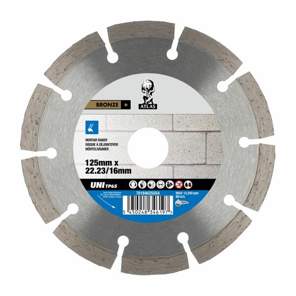Atlas TP gyámántvágókoronga tégla és a blokkok közötti habarcs-illesztések eltávolítására. Szegmentált gyémánt vágókorong 6,5 mm vastag szegmensekkel. Avágókorongszélesebb szegmensei több habarcsot távolítanak el, így időt takaríthat meg, és nagyobb biztonságot nyújt a szokásos gyémánt tárcsákhoz képest. MŰSZAKI ADATOK Gyártói cikkszám: 70184625554 Átmérő