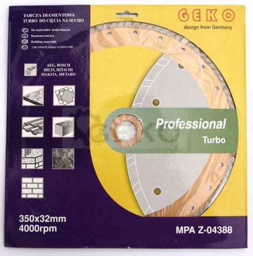 Professzionális turbó gyémánt penge beton, tégla, üreges tömbök és más kőtömbök vágásához. A lemez állandó érintkezése a vágott anyaggal egyenletesebb vágást biztosít a szegmentált lemezekhez képest. A termék jellemzői: átmérő - 350 mm szerelési furat - 32 mm a töltés magassága 8 mm a lemez tartós acélmagja magas gyémánt koncentráció