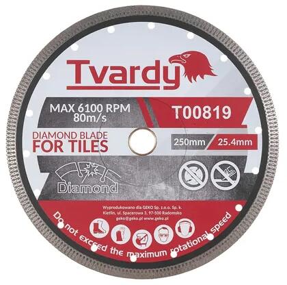 Professzionális gyémánt vágótárcsa greshez a Tvardy márkától. A tárcsa zárt profilú, bordázott peremmel rendelkezik , és kemény anyagok vágására alkalmas, mint például: porcelán gres, márvány, cserép, gránit, homokkő, kvarc . A gyémánt vágótárcsa átmérője 250 mm és vastagsága 1,6 mm. 10 mm magas és 2,0 mm vastag gyémántszórással rendelkezik. A termék jelle