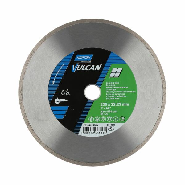 Norton Vulcan Ceramic szinterezett gyémánt vágókorong folyamatos vágóéllel. Kerámia anyagok, például kerámialapok, csempe, terrakotta, kőedények, klinker vágására tervezték vizes vágáshoz. Sarokcsiszolókhoz és csempevágó gépekhez egyaránt alkalmas. MŰSZAKI ADATOK Gyártói cikkszám: 70184625184 Átmérő: 230 mm Furat: 22,23 mm Szegmens magasság: 7 mm Szegmens széless