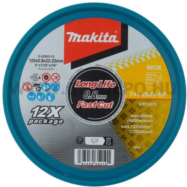 Makita E-22953 vágótárcsa inoxhoz 125x0,8 mm Z60V-BF - 12 db Ø 125 mm 0,8 mm Z60V-BF INOX 12 db INOX vágótárcsák, amelyeket kifejezetten a hosszabb élettartam érdekében fejlesztettek ki akkumulátoros gépekkel együtt. Nagyon vékony vágókorongok mindössze 0,8 mm vastagsággal. A továbbfejlesztett gyanta kötőanyag meghosszabbítja a lemez élettartamát. Alkalmas acélhoz és roz