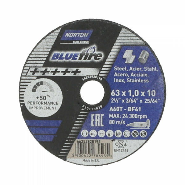A Norton Blue Fire vágókorongot egyenes és sarokcsiszolóhoz, nagyon magas szintű teljesítményt (akár 50%-al több vágás, mint a standart vágókorongok) és minőséget kínálva. Nagyteljesítményű csiszolószemcsék, hosszú élettartam és kényelmes munka. Fém és Inox anyagokhoz. MŰSZAKI ADATOK Gyártói cikkszám: 66252828195 Átmérő : Ø63 mmVastagság : 1,0 mm Furat : 10 mm