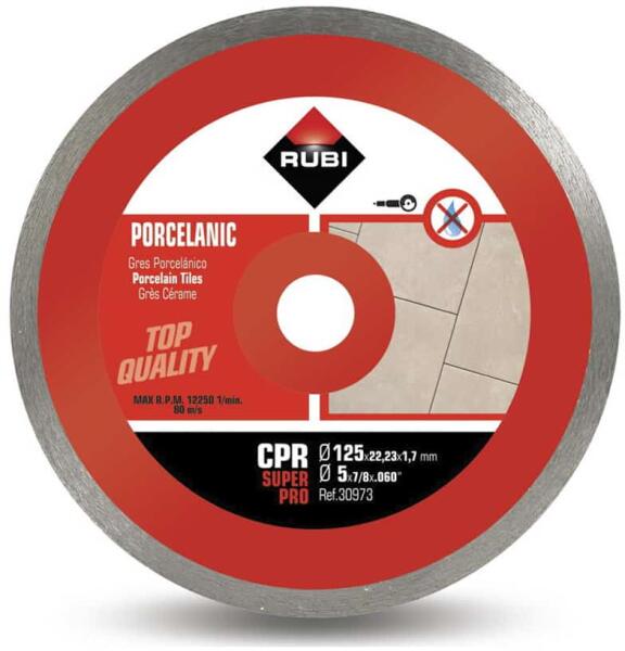 Porcelánlapok és kemény anyagok száraz vágásához. Átmérő: 125 mm; furatátmérő: 22,2 mm; szegmensmagasság: 7 mm; szegmensvastagság: 1,7 mm. Ref: 30973