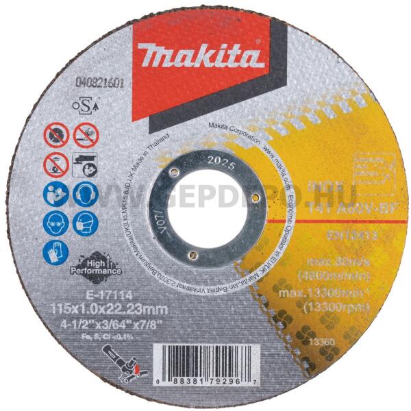 Makita E-17114 vágótárcsa inoxhoz 115x1mm A60V Speciális magas minőségű korongHosszú élettartam, gyors vágásIdeális a rozsdamentes fémekhez, acélhoz Műszaki jellemzők: A tárcsa átmérője: 115 mm Anyag: Alumínium-oxid [A] Tengelytárcsa: 22,23 mm A penge maximális vastagsága: 1 mm Méretek: 115x22,23x1,0 mm