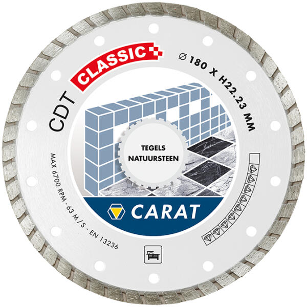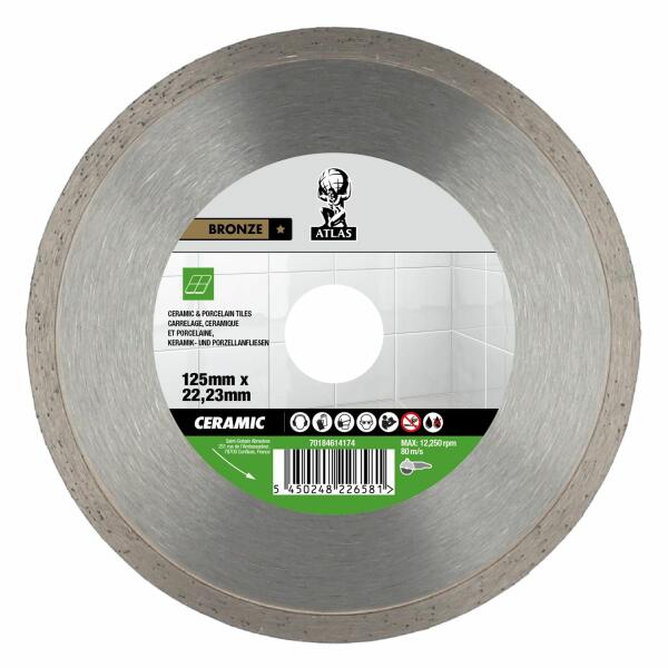 Az Atlas Ceramic Tiles kiváló minőségű gyémánt vágókorong szinterezett folytonos éllel kerámiák vágásához, beleértve a kőedényeket, porcelánokat és mázas csempéket. A hosszabb élettartamot a továbbfejlesztett 5 mm magas szegmens biztosítja. Előnyök: alkalmazások széles választéka, folytonos éle jó, pontos és gyors vágást biztosít, az 5 mm magas szegmens haszná
