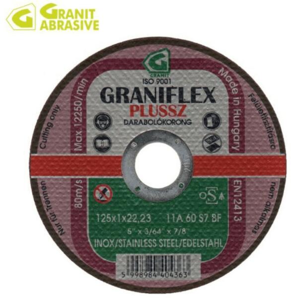 INOX fémvágókorong minőségi munkákhoz, rozsdamentes anyaghoz Graniflex 11A inox vékony vágókongok. Gyors, pontos és gazdaságos kompozitszerszám. Felhasználási terület inox és szerkezeti acélok darabolására felület tisztításra nem alkalmas Előnyök/Kivitelek vágás közben lágyabb viselkedés munkadarab felületének beégése meggátolva Anyag Fe+S+Cl mentes