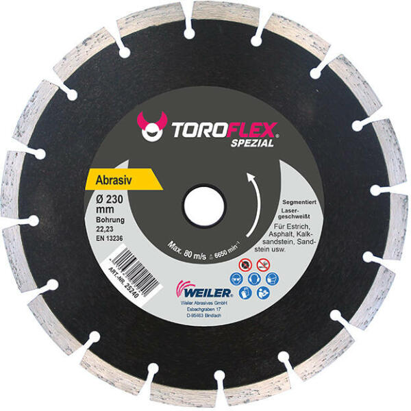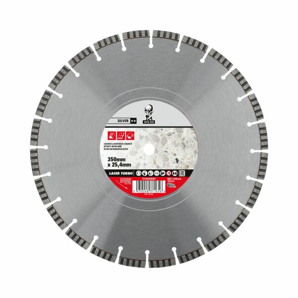 Az Atlas Turbo Laser gyémánt vágókorongot nagyon hosszú élettartam jellemzi többek között a lézerhegesztett szegmenseknek köszönhetően. Minőségi eszköz magas igényekhez, kiváló ár-teljesítmény arány, magas gyémántkoncentráció, tiszta vágás. Alkalmazási területek: beton, útburkolat, tetőcserép, gránit, márvány, általános építőanyagok. Vizes és száraz vág