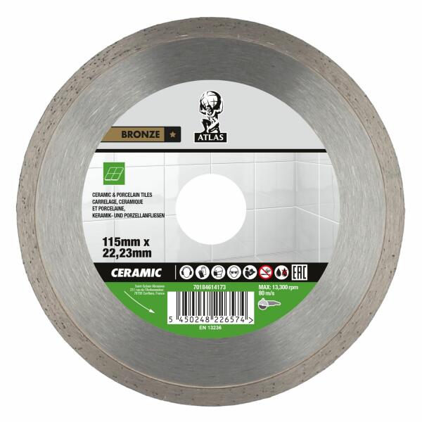 Az Atlas Ceramic Tiles kiváló minőségű gyémánt vágókorong szinterezett folytonos éllel kerámiák vágásához, beleértve a kőedényeket, porcelánokat és mázas csempéket. A hosszabb élettartamot a továbbfejlesztett 5 mm magas szegmens biztosítja. Előnyök: alkalmazások széles választéka, folytonos éle jó, pontos és gyors vágást biztosít, az 5 mm magas szegmens haszná