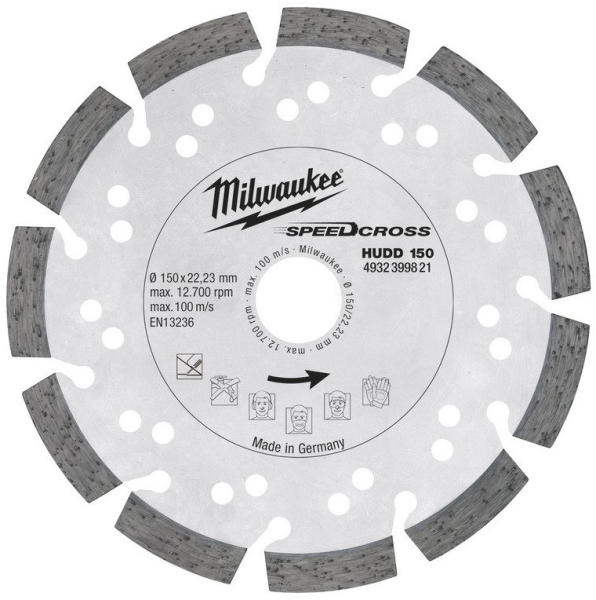 Milwaukee HUDD 150 Gyémánt vágókor ong 150m m Maximum sebesség, legjobb élettartam, alacsony vibráció. Univerzális tárcsakülönböző anyagokhoz. Két kategóriában osztályozva a maximális élettartamért. 10 mm magasságú szegmensek biztosítják a tárcsa hosszú élettartamát. Lézerhegesztésű szegmensek a felhasználók 100%-os biztonságát biztosítják Alkalmazási terüle