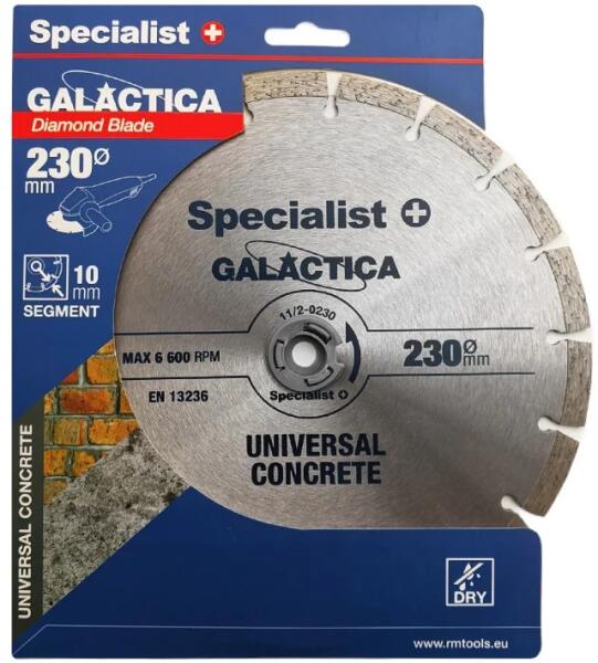 Természetes kőzet, beton és tégla vágására. Átmérő: 230 mm Tárcsa geometria: Illesztett szegmensek Szegmens alakja: Turbo Szegmens magasság: 10 mm Furat: 22.2 mm