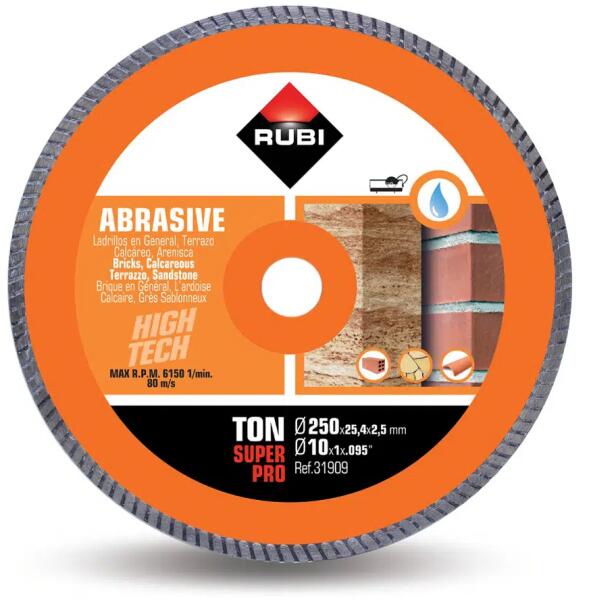 Gyémántpenge olyan koptató hatású anyagok vágására, mint a friss beton, homokkő, tégla, cserép, előregyártott és nedves égetett agyag. Átmérő: 250 mm; furat: 25,4 mm; szegmensmagasság: 7,5 mm; szegmensvastagság: 2,5 mm. Ref: 31909