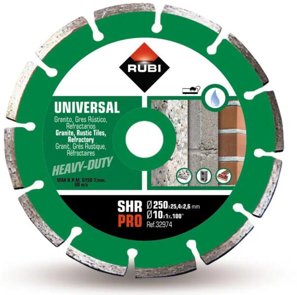 A gyémánt univerzális penge nedves vágáshoz különböző építőanyagokhoz, például téglához, betonhoz, terrazzóhoz készült. Átmérő: 250 mm. Furat: 25,4 mm. A szegmens magassága 10 mm. Ref: 32974
