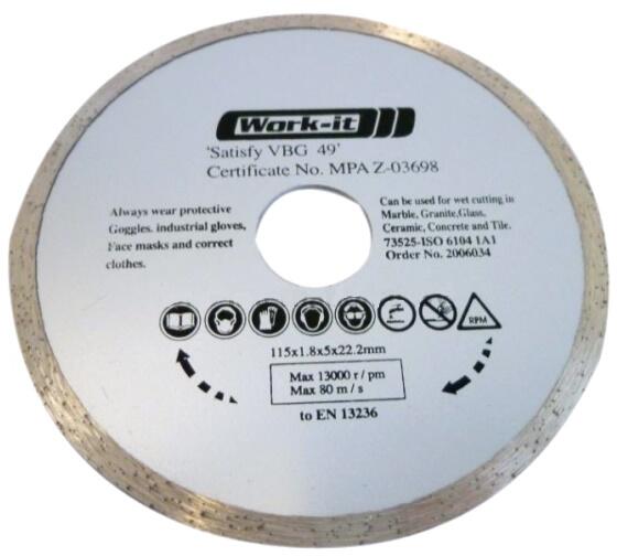 Csempék, Gres lapok, természetes kő vágására. Átmérő: 115 mm Tárcsa geometria: Folyamatos Szegmens alakja: Sík Szegmens magasság: 10 mm Furat: 22.2 mm
