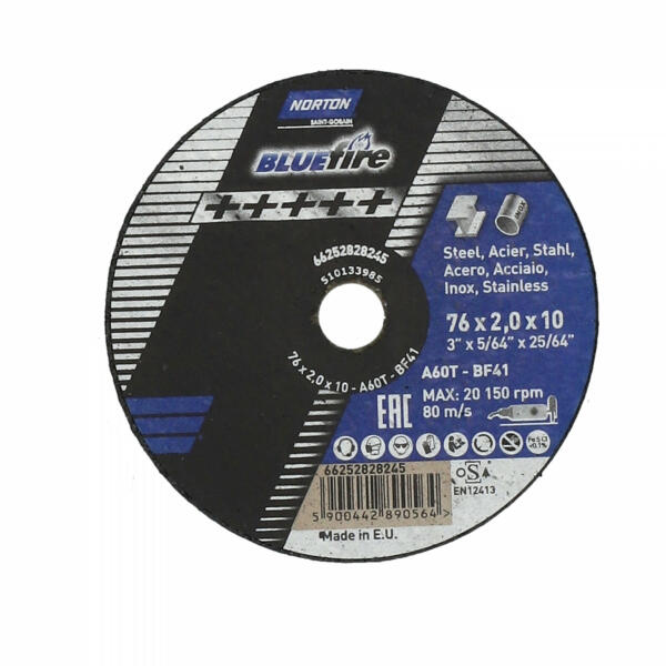 A Norton Blue Fire vágókorongot egyenes és sarokcsiszolóhoz, nagyon magas szintű teljesítményt (akár 50%-al több vágás, mint a standart vágókorongok) és minőséget kínálva. Nagyteljesítményű csiszolószemcsék, hosszú élettartam és kényelmes munka. Fém és Inox anyagokhoz. MŰSZAKI ADATOK Gyártói cikkszám: 66252828245 Átmérő : Ø76 mmVastagság : 2,0 mm Furat : 10 mm