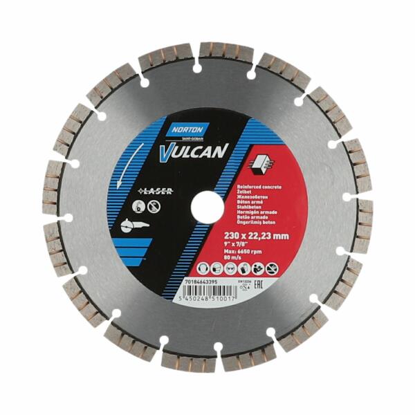 Norton Vulcan Turbo Laser gyémánt vágókorong lézerrel hegesztett turbó szegmensekkel az építőanyagok széles skáláján történő intenzív használatához. Száraz vagy nedves vágás. A turbószegmensek agresszív vágást tesznek lehetővé kemény anyagokon. Alkalmazás: beton és természetes kövek, építőanyagok. MŰSZAKI ADATOK Gyártói cikkszám: 70184643395 Átmérő: 230 m