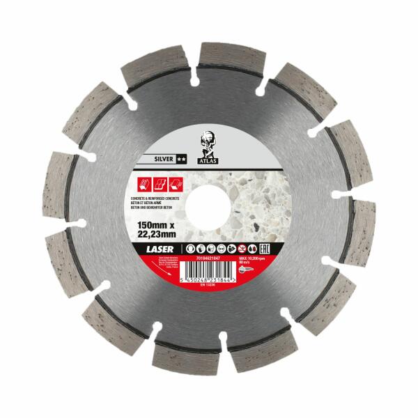 Atlas Laser gyémánt vágókorong kiváló minőségű anyagból készült, megnöveli az élettartamot és a teljesítményt. Száraz és nedves vágáshoz tervezve. A szegmentált profilnak és a lézer hegesztésnek köszönhetően a vágókorong könnyen megbirkózik a különféle kemény anyagok vágásával, anélkül, hogy hosszú időn keresztül elveszítené tulajdonságait. Minőségi