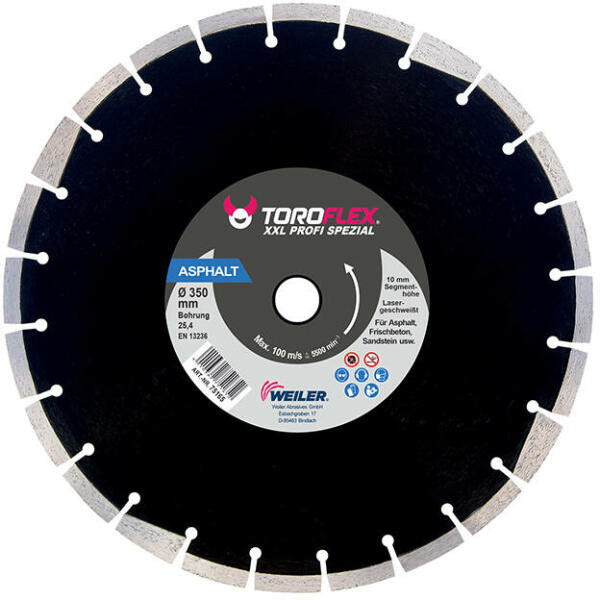 Lézer hegesztett szegmensekkel Védőszegmensekkel ellátott Aszfalt burkolatok vágására járdavágó gépekkel Koptató hatású építési anyagok vágására járdavágó gépekkel: aszfalt, friss beton, gázbeton, mészhomokkő, klinker, samott cikkszámtárcsa ø (mm)furat ø (mm)szegmensmagasság (mm)kerületi sebesség (m/s)max. ford. (1/min)010301-002230025,4SH1080133000103 01-00483502