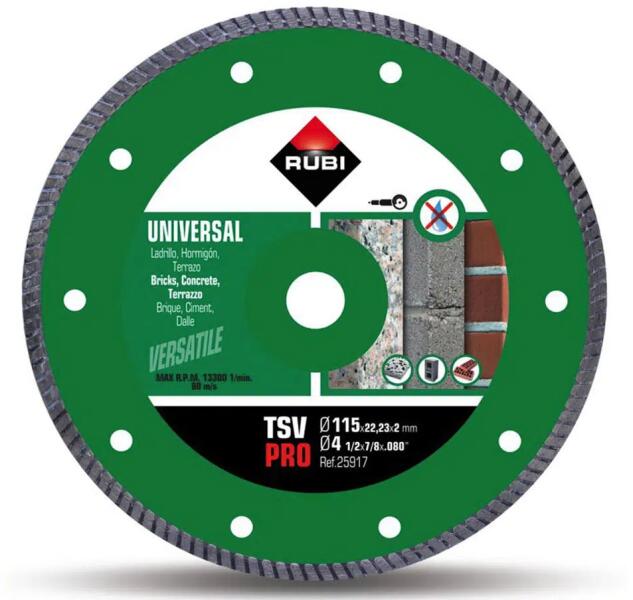 RUBI univerzális penge építőanyagok száraz vágásához. Átmérő: 115 mm; furat: 22,2 mm; szegmensmagasság: 7 mm; szegmensvastagság: 2 mm. Ref: 25917