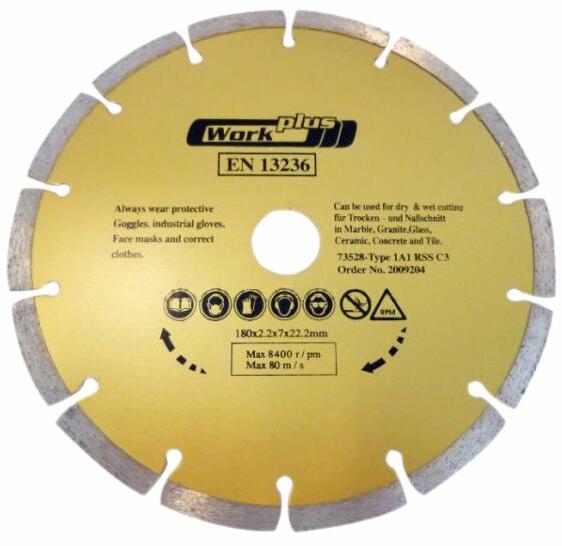 Gyémántkorong szegmenses 180 × 22,23 mm × 2,3 mm - márvány, gránit, üveg, beton, cserép vágásához ajánlott - ipari gyémánt vastagság 2,3 × 7,5 mm - max. 8400 fordulat Kód:073528