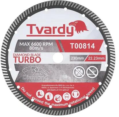 Professzionális gyémánt vágótárcsa a Tvardy márkától. A TURBO profilú tárcsa építőanyagok, például beton, vasbeton, tégla, kő, járda, márvány, gránit, homokkő, aszfalt vágására alkalmas. A gyémánt vágótárcsa 230 mm átmérőjű és 1,8 mm vastag . 10 mm magas és 2,8 mm vastag gyémántszemcsékkel rendelkezik. A termék jellemzői: Professzionális gyémánt vágót