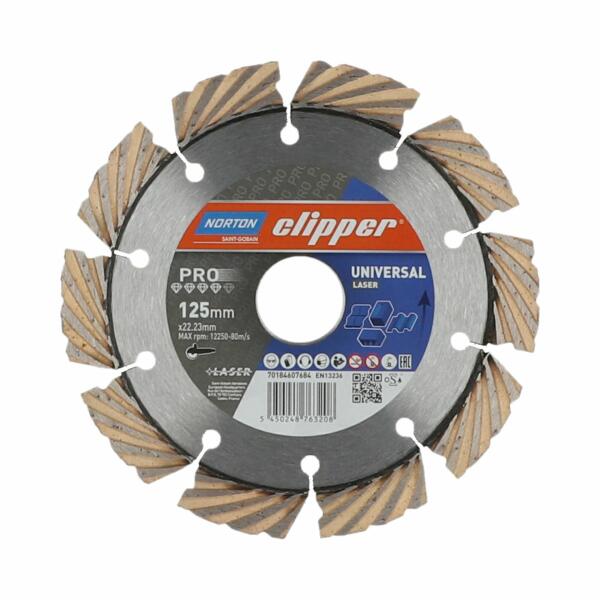 A Norton Clipper Pro Universal Laser egy erős vágótárcsa, amelyet kifejezetten betonlapok és általános építőanyagok megmunkálására terveztek. 12 mm magas szegmenseivel lenyűgöző élettartamot kínál, így tartós és megbízható választás építési és felújítási projektekhez. A gyémánt tárcsa sokoldalú, száraz és nedves vágást is lehetővé tesz. A 12 mm magas szeg