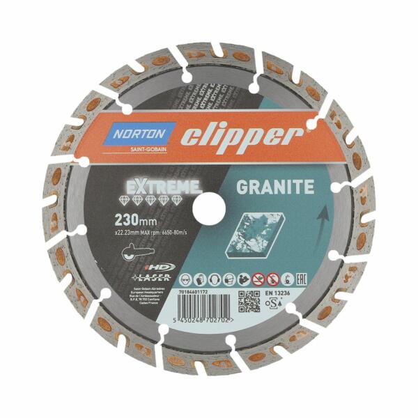 A Norton Clipper Extreme Granite egy rendkívül speciális gyémánt vágókorong, amelyet kemény anyagok, például gránit és természetes kő megmunkálására terveztek. A duó alakú trapéz szegmenseket kiemelkedő vágási sebességük és alacsony vibrációjuk jellemzi, ami optimális vágási kényelmet biztosít a kezelő számára. A vágókorong 15 mm magas, lézerrel hegesztett du