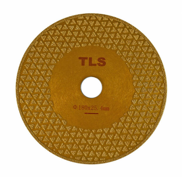 TLS VACUUM 2 SIDE TRIANGLE GOLDEN vákuum forrasztott gyémánt vágó- és csiszolótárcsa 2 oldalas Átmérő: d=180 mm (25.4/22.23 mm furat) Alkalmazás: száraz és vizes Szegmensvastagság: 2.5 mm Szemcseméret: durva ( #30/40 ) Alkalmazásiterület: Márvány, beton, műkő, sírkő, kerámia, normál gránithoz használható, ( kemény gránithoz viszont nem ajánlott! ) TLS ELECTROPLATED