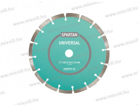 A Sankyo SPARTAN szegmentált gyémánttárcsa az egyik legnépszerűbb univerzális vágókorong, mely általános építőipari anyagok vágására alkalmas. - Universal-standard kategória - Általános építőipari használatra kifejlesztve - beton, tégla, terméskő, tetőcserép vágására - 10mm vastag gyémántréteggel - Átmérő: 230 mm - Furat: 22,2mm
