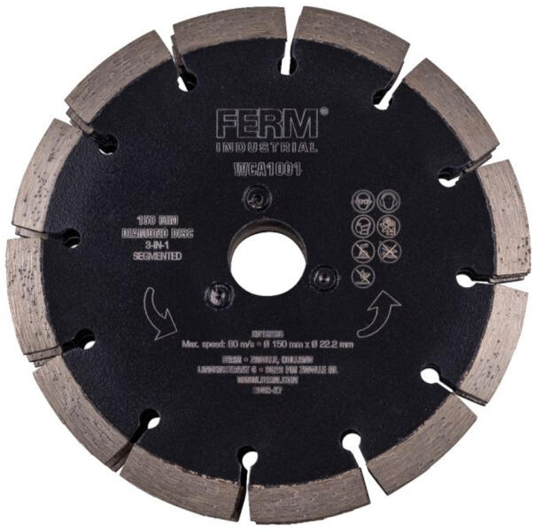 Ez a 3 az 1-ben fűrészlap a FERM Industrial termékcsalád WCM1001P falhoronymarójához használható. Ez a hármas gyémánttárcsa speciális, ferdén elhelyezett fogakkal rendelkezik, amelyekkel vésés nélkül készíthet hatékony vágásokat. Ezenkívül a pengék speciális bordákkal vannak ellátva, hogy a penge jobban hűtött maradjon. Mérete: 150x22.2mm