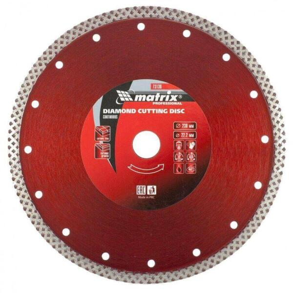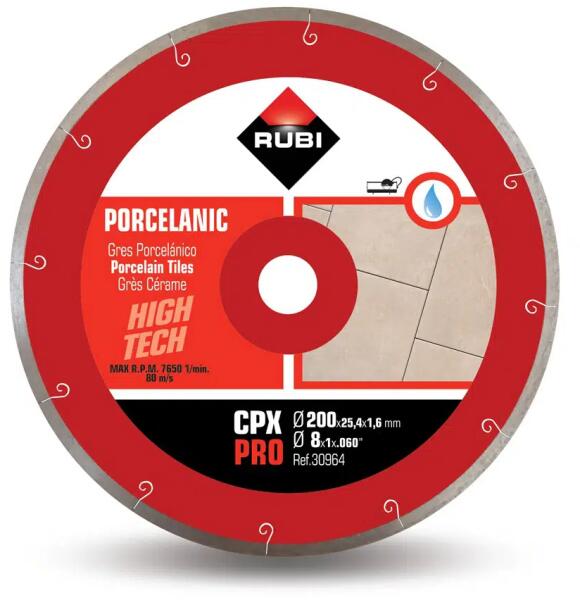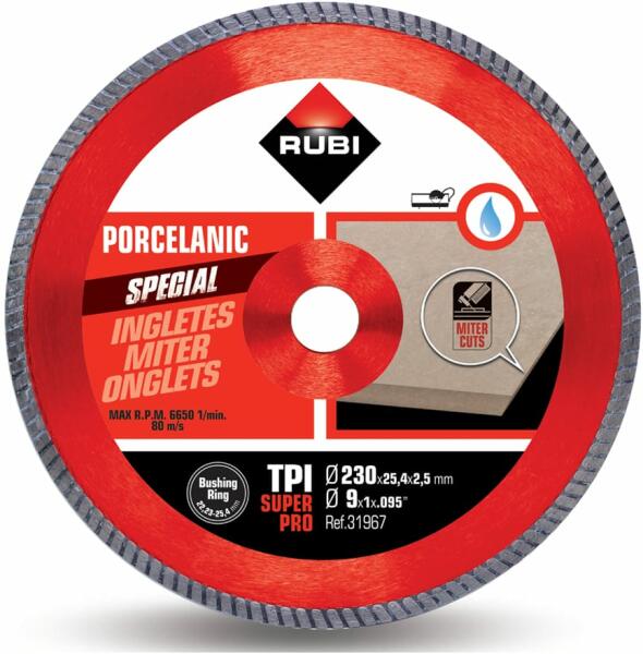 RUBI gyémánttárcsa, amelyet kifejezetten a porcelánlapok ferde vágásainak nedves vágásához terveztek. Átmérő: 230 mm; furatátmérő: 25,4 mm; szegmensmagasság: 7,5 mm; szegmensvastagság: 2,5 mm. Ref: 31967