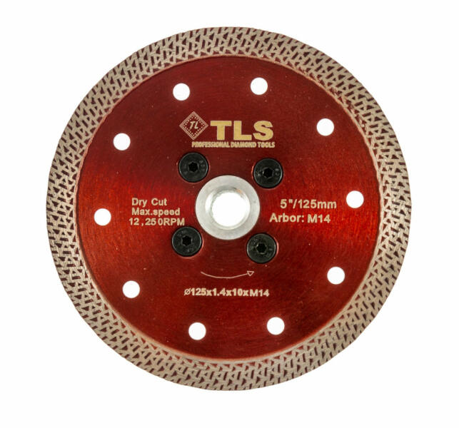 TLS K-PRO TURBO ultravékony gyémánt vágókorong Átmérő: d=150 mm Furatátmérő: d=2M14 mm Vágószegmens magasság : 10 mm Vágó szegmens vastagság: 1.6 mm Alkalmazás: száraz és vizes használat Alkalmazási terület: Gres, kőporcelán, kemény kerámiák, gránit, márvány, csempe, kemény anyagok, tégla, egyéb építőipari anyagok, stb. TLS K-PRO TURBO ULTRAVÉKONY GYÉMÁNT V
