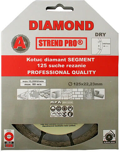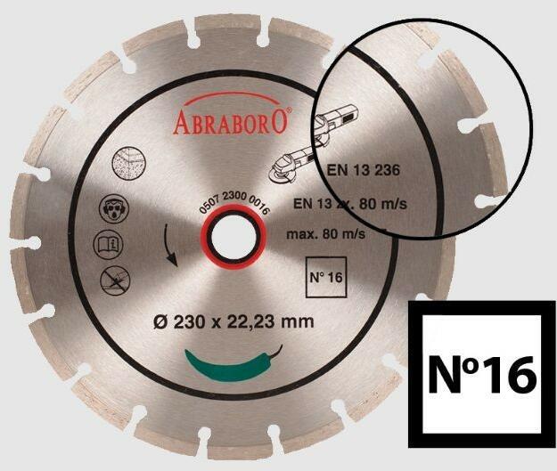Jellemzők: Alkalmazási terület: Univerzális - általános építőanyagok, mint például beton, betoncsövek, szegélyek, Poroton, mész-mész tégla, tetőcserepek, kompozit kövek, falazott téglák, pórusbeton és járólapok. Átmérő: 230 mm Furat: 22,23 mm H szegmens: 15 mm