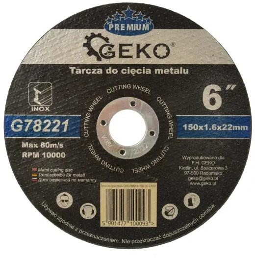 Műszaki adatok: A csiszolószemcsék típusa: elektrokorundált Bond típus: megerősített gyanta A tárcsa külső átmérője: 150 mm A szerelő furat átmérője: 22,23 mm A tárcsa vastagsága: 1,6 mm Maximális forgalma: 10 000 ford. /perc Megengedett lineáris V sebesség: 80 m / s Fémvágó lemez INOX 150x1,6x22.23 GEKO Premium Korund lemez korrózióálló acél, normál és finom acél