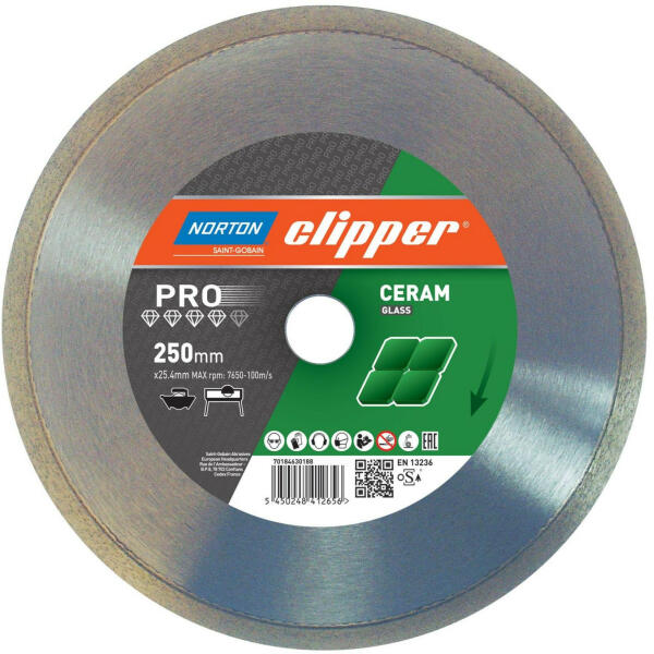 A zománcozott anyagok vágására tervezett Norton Clipper Pro Ceram Glass gyémánt pengék kiváló minőségű eszközök, amelyek minden körülmények között jól teljesítenek. Különösen üveg, szerkezeti üveg és zománcozott kerámia burkolólapok vágására ajánlott. A dedikált Norton Clipper Pro Ceram Glass specifikációnak köszönhetően ez garantálja az üveg és a kerámi