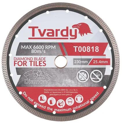 Professzionális gyémánt vágótárcsa greshez a Tvardy márkától. A tárcsa zárt profilú, bordázott peremmel rendelkezik, és kemény anyagok vágására alkalmas, mint például: porcelán gres, márvány, cserép, gránit, homokkő, kvarc . A gyémánt vágótárcsa átmérője 230 mm és vastagsága 1,6 mm . A gyémánt réteg magassága 10 mm és vastagsága 2,0 mm . A termék jellemz