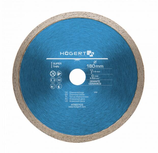 magas gyémántkoncentráció; szinter ezett vágóél; az optimális vágási sebesség és a penge tartósság tökéletes párosítása; sorjamentes vágás; stabil test az optimális körkörös mozgáshoz; a DIN 13236 szabvány szerint gyártva.