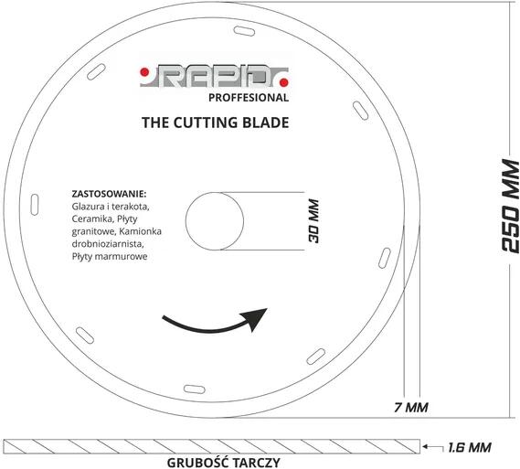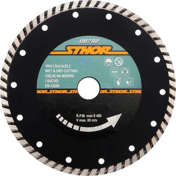 Univerzális gyémánttárcsa sarokcsiszolókhoz. Kerámia, beton, tégla, kő, mészkő, vasbeton és gránit vágásához ajánlott. Átmérő: 180 mm Tárcsa vastagsága: 1,6 mm Szorító átmérő: 22,2 mm Vágási szegmens magassága: 7,5 mm A vágószegmens vastagsága: 2,4 mm A vágószegmens kémiai összetétele: Fe 30%, Su 50%, Sn 10%, Ni 5%, Co 5%, gyémántbevonat 12%. Anyag: Acél 65M