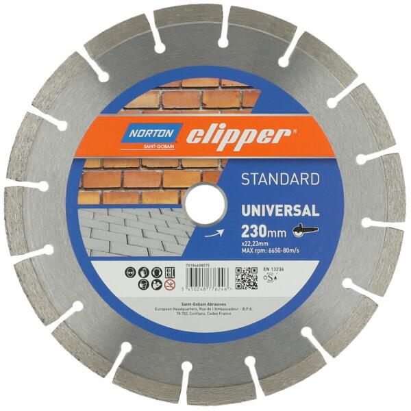 A Norton Clipper Standard Universal egy kiváló minőségű szegmentált gyémánt vágókorong, amelyet kifejezetten általános építőanyagok, például téglák, járdalapok vagy betontömbök megmunkálására terveztek. Ez a tárcsa ideális az építőipar számos alkalmazásához, és lehetővé teszi a precíz vágást különféle anyagokon. A Norton Clipper Standard Universal termékc