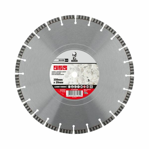 Az Atlas Turbo Laser gyémánt vágókorongot nagyon hosszú élettartam jellemzi többek között a lézerhegesztett szegmenseknek köszönhetően. Minőségi eszköz magas igényekhez, kiváló ár-teljesítmény arány, magas gyémántkoncentráció, tiszta vágás. Alkalmazási területek: beton, útburkolat, tetőcserép, gránit, márvány, általános építőanyagok. Vizes és száraz vág