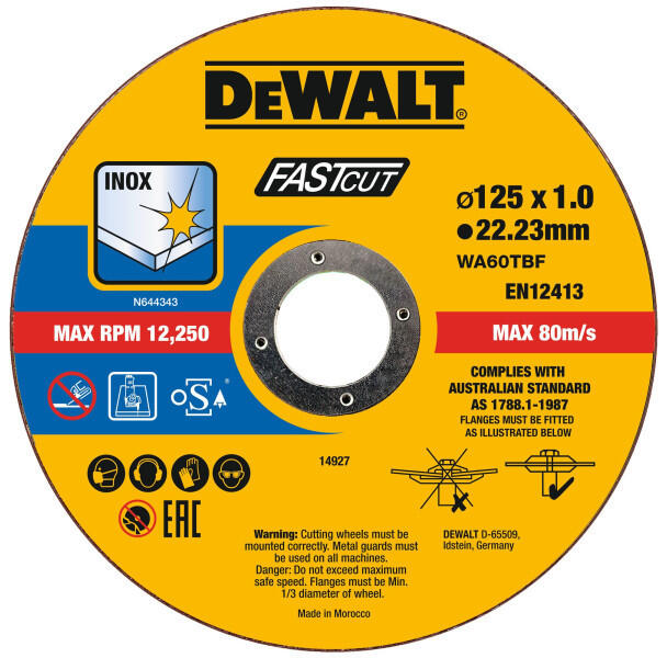 DEWALT Vágókorong fémre 125 x 1,0 x 22,2 mm inox WA60TBF vödrös kiszerelés (100 db)