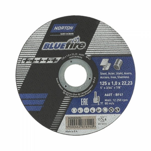 A Norton Blue Fire vágókorongot egyenes és sarokcsiszolóhoz, nagyon magas szintű teljesítményt (akár 50%-al több vágás, mint a standart vágókorongok) és minőséget kínálva. Nagyteljesítményű csiszolószemcsék, hosszú élettartam és kényelmes munka. Fém és Inox anyagokhoz. MŰSZAKI ADATOK Gyártói cikkszám: 66252828256 Átmérő : Ø125 mmVastagság : 1,0 mm Furat : 22,2
