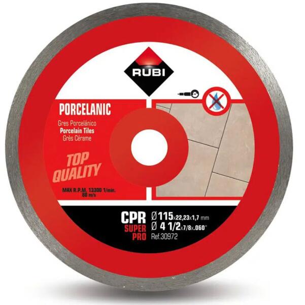 Porcelánlapok és kemény anyagok száraz vágásához. Átmérő: 115 mm; furat: 22,2 mm; szegmensmagasság: 7 mm; szegmensvastagság: 1,7 mm. Ref: 30972