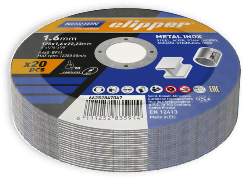 Egyenes vágókorong hosszabb élettartamot, tartósságot és nagy anyagleválasztást biztosít fém és fém-inox alkalmazásoknál. Vas-, kén- és klormentes, megszünteti a szennyeződést vágáskor. Ideális fémlemezek és csapok vágásához. A korong akkus gépekhez készült, és úgy fejlesztették ki, hogy használat közben minimális ellenállást biztosítsanak. A kerék szabad v