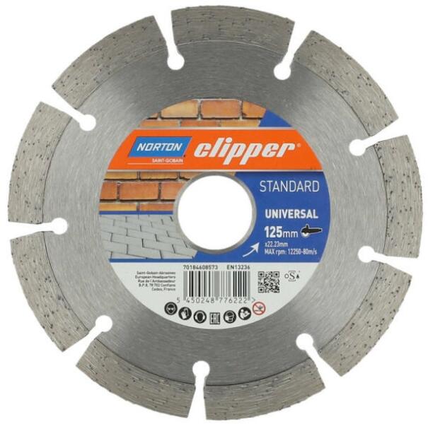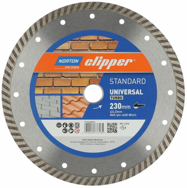 A Norton Clipper Standard Universal Turbo egy kiváló minőségű, szinterezett gyémánttárcsa, amely különösen alkalmas különféle építőanyagokhoz. Zárt turbóvágó éle kiváló vágási minőséget biztosít olyan általános építőanyagokon, mint a tégla, járólap vagy betontömb. Ennek a gyémánt korongnak az erőssége az agresszív vágásban rejlik, amelyet kifejezetten k
