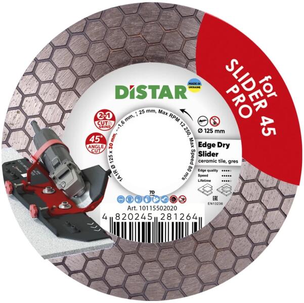 DISTAR gyémántvágó kerék, amelyet kifejezetten a MECHANIC SLIDER 45 PRO 2.0 jolly edge jighez terveztek. Átmérő: 125 mm; Középfurat: 30 mm; Szegmensvastagság: 1,6 mm; Száraz vágás. Ref: 10115502020