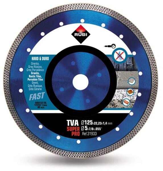 Gyémántpenge a legkeményebb anyagok, például gránit, rusztikus csempe, klinker, pala és porcelán száraz vágásához. Átmérő: 125 mm; furat: 22,2 mm; szegmensmagasság: 10 mm; szegmensvastagság: 1,4 mm. Ref: 31933
