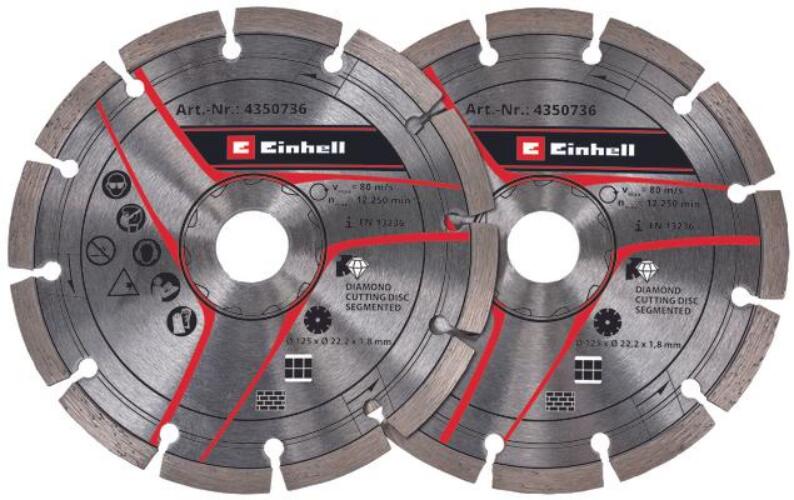 Einhell Vágókorong 125 mm falmaró tartozék (4350736): Az eredeti Einhell 125 mm-es gyémánt vágótárcsa készlet praktikus kiegészítő falvágókhoz. A két gyémánt vágótárcsa egy fali horonyvágóval együtt használatos a falazat hornyainak és hornyainak erőteljes marásához. Különösen alkalmasak kő, beton, csempe, kerámia, porcelán kőedény, márvány és gránit marás