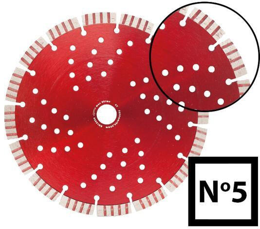Gyémánttárcsa No. 4 Csúcsminőségű tárcsa lézerhegesztett szegmensekkelEgyedi szegmens geometria, kimagasló vágási teljesítményHűtési lyukak az alaplaponKiválóan alkalmas beton, öregbeton, vasbeton, betoncserép, eternit, samott, terméskő, márvány, gránit, mészkő, térkő, járdaszegélykő, építőipari acélháló, acél