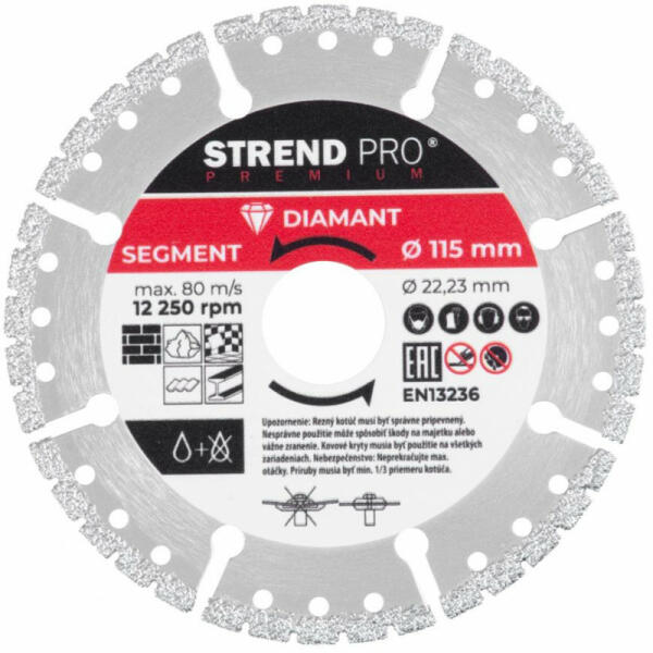 A termék leírása : multifunkcionális gyémánt vágótárcsa 115 mm-es alkalmas tégla, falazat, kő, járólap, cserép, betoncserép, fém, műanyag, fa, beton, vasbeton, gránit, márvány vágására, darabolására száraz és nedves vágásra max. fordulatszám : 12250 ford. /perc